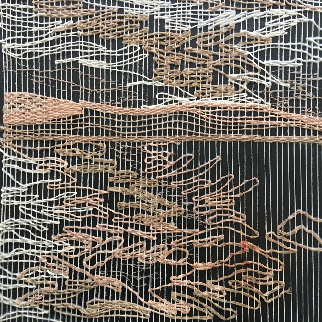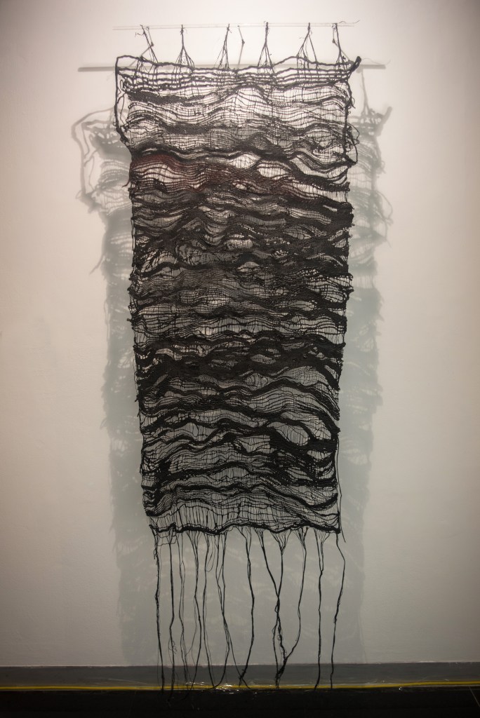 Punto medio, tejido en algodón nativo peruano.La obra explora la tensión y la distensión